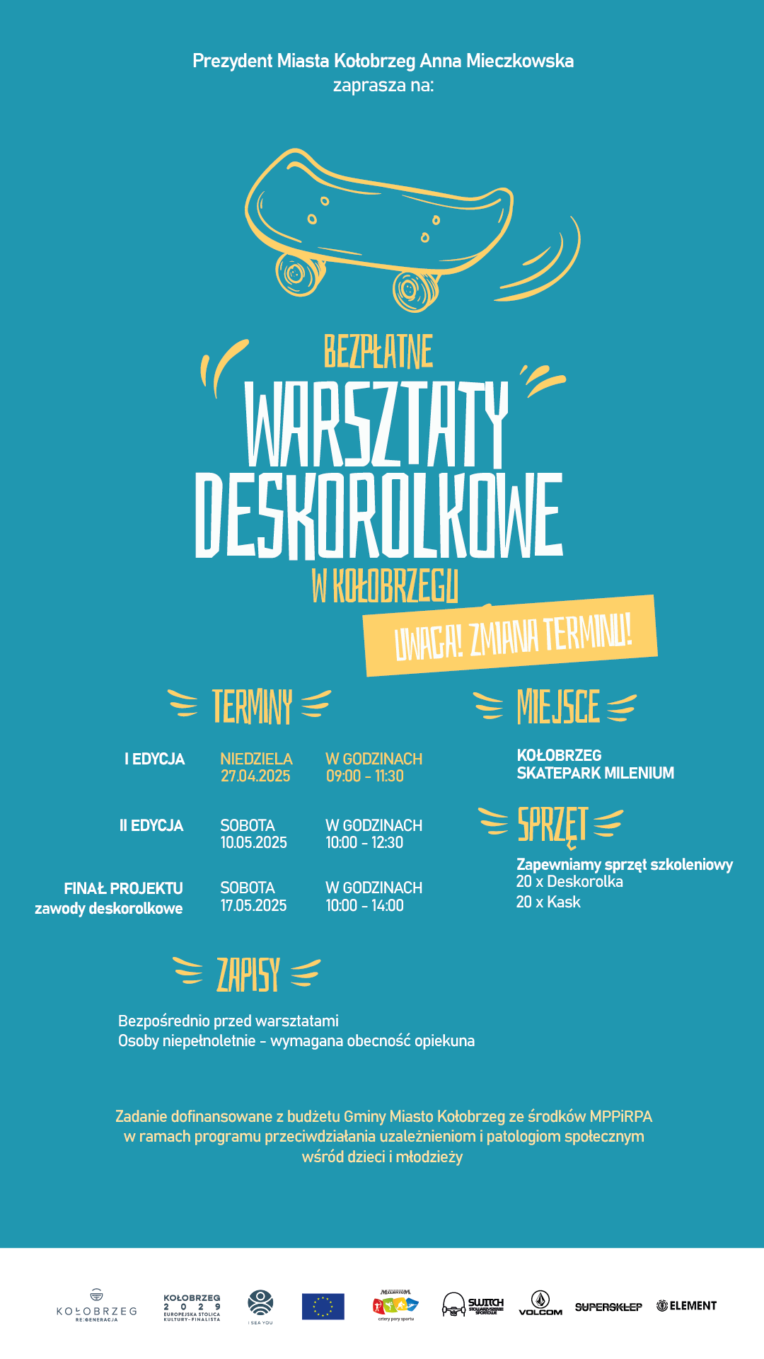 Zapisy na miejscu – liczba miejsc ograniczona (sprzęt: 20 desek + 20 kasków)